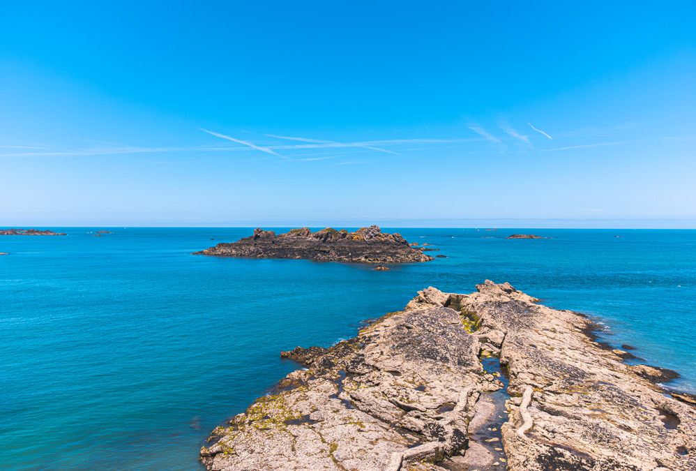 La Pointe de Bezouh, à l’extrémité nord de Saint-Malo, est un lieu où la mer et les rochers se rencontrent avec une intensité rare. Ici, les falaises escarpées se jettent dans l’océan, encadrant les célèbres rochers sculptés de Rothéneuf, mystérieux témoins du talent de l’abbée Fourré. Chaque pierre raconte une histoire, façonnée par le vent, les vagues et le temps.